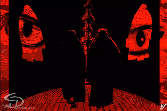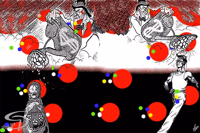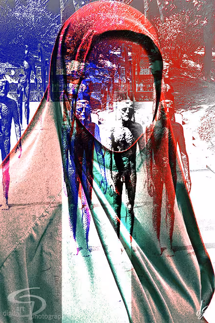 Digital Art: A Jewish-Orthodox father with his three sons (Israel). Digital Art: An allegory of communism in Prague (Czech Republic). Digital Art: Trump and Putin behind bars. Digital Art: Huge cat's eyes watching two women in a Chador (Istanbul - Turkey). Digital Art: Kim Jong's face, surrounded on the right and left by Trump's profiles.