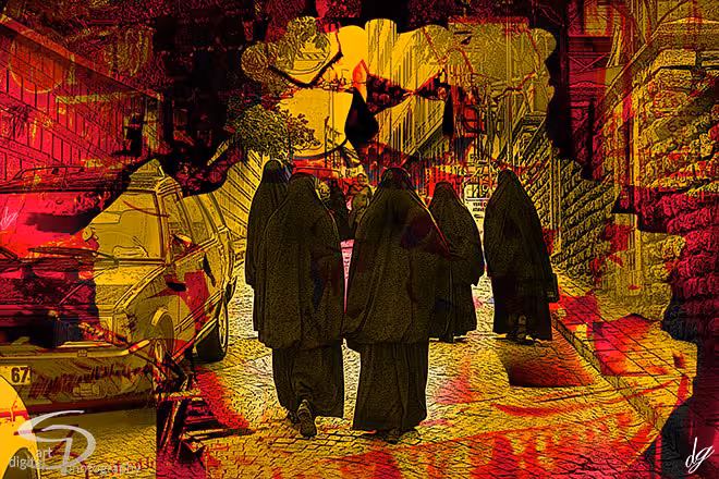 Digital Art: A woman in a Chador without a face, in which three men are reflected (Turkey). Digital Art: Walking ladies in Istanbul dressed in Chador from behind (Istanbul - Turkey). Digital Art: Three women without faces wearing a hijab (Turkey). Digital Art: Recep Tayyip Erdogan behind bars wearing a hijab (Turkey).