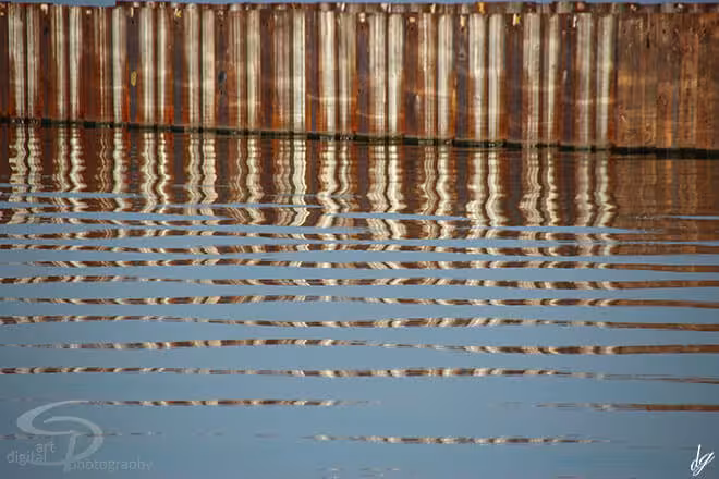 Water reflections top brown bottom blue color. The title of the picture is called - Reflections. Iron lock on blue background. The title of the picture is called - Silver Gun.