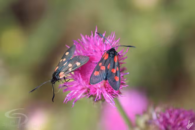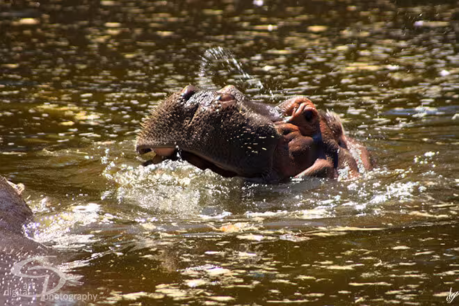 Two butterflies (Zygaena filipendulae)on a flower. The title of the picture is called - Two. You can see a mother swan with her 3 chicks. The title of the picture is called - The Family. Hippo with open muzzle in the water. The title of the picture is called - My hippo.